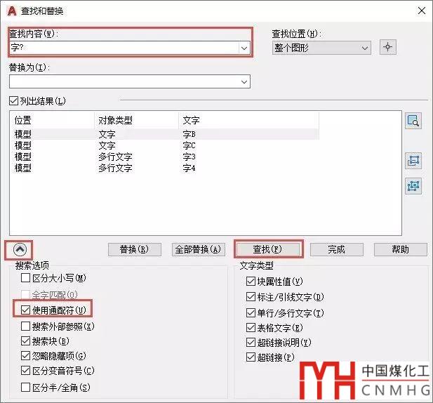 重新打開查找對話框,單擊左下角向下的箭頭,展開查找對話框中的搜索選項,勾選“使用通配符”,然后在查找內(nèi)容欄輸入“字?”,單擊“查找”按鈕,就可以將滿足條件的文字都選擇出來,如下圖所示。