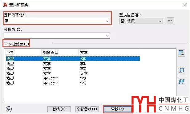 輸入FIND命令,回車,打開查找對話框,在“查找內(nèi)容”文本框中輸入“字”,勾選“列出結(jié)果”,然后單擊“查找”按鈕,對話框中會累出找到的所有包含“字”的文字,如下圖所示。