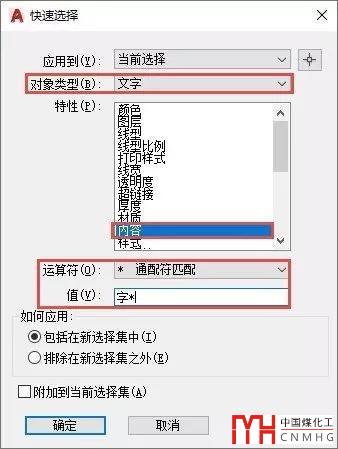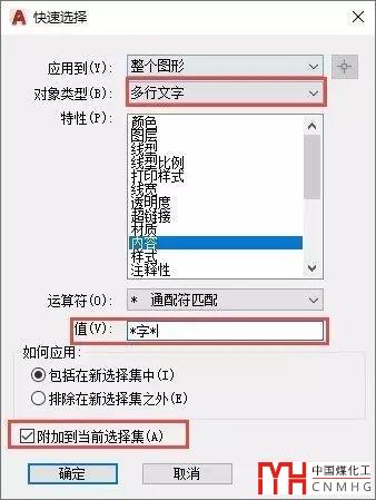 如果我們在值一欄中輸入*字*,就可以將所有包含“字”的單行文字都選中。但如果還想將包含“字”的字符同時選中,還需要再執(zhí)行一次快速選擇,將對象類型設(shè)置為多行文字,然后勾選“附加到當(dāng)前選擇集”,如下圖所示。