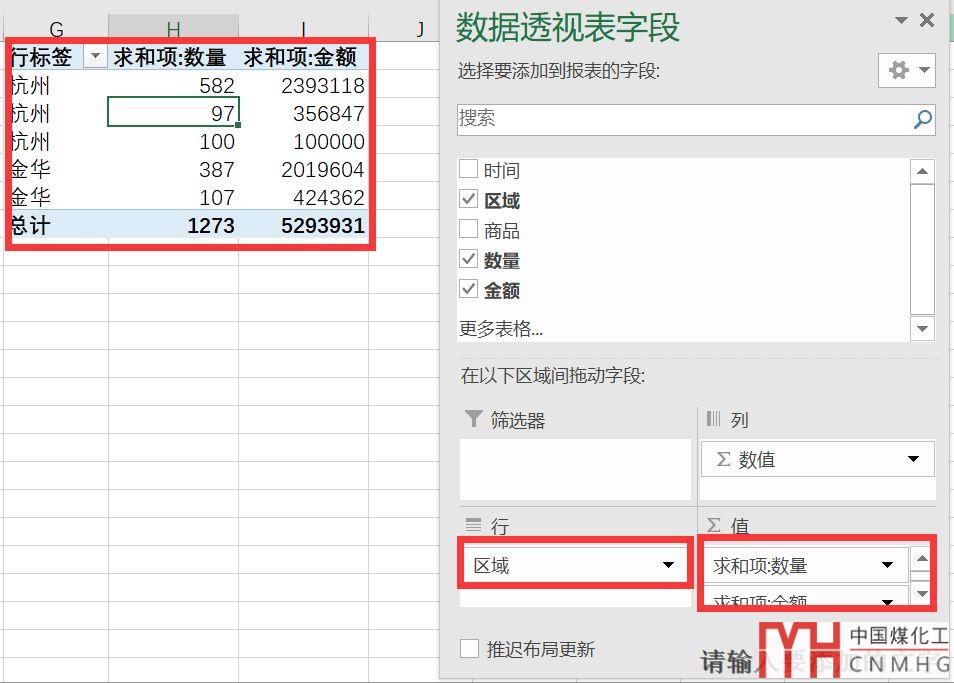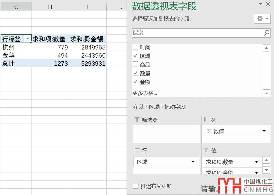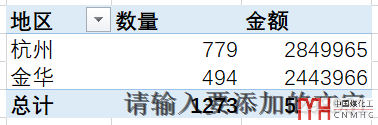 把原始數(shù)據(jù)中的空格查找替換掉之后,再用原來的方法,插入數(shù)據(jù)透視表,區(qū)域放在行標簽,數(shù)量和金額放在值,便得到了我們想要的結果。