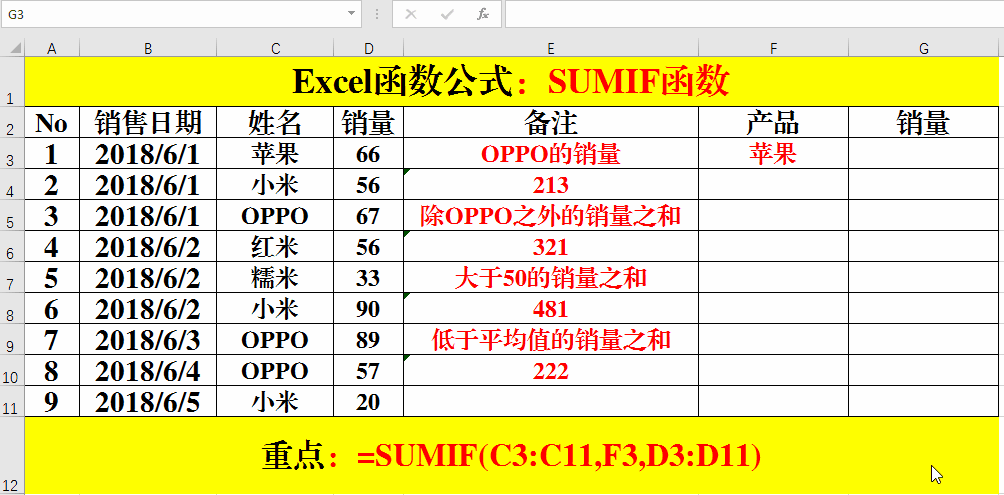 在目標(biāo)單元格中輸入公式:=SUMIF(C3:C11,F3,D3:D11)。