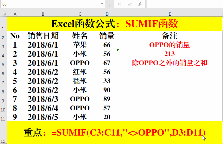 在目標(biāo)單元格中輸入公式:=SUMIF(C3:C11,"<>OPPO",D3:D11)。