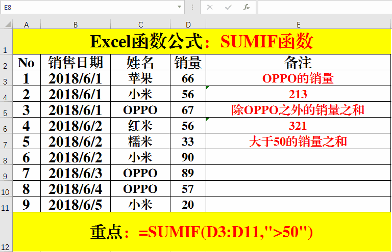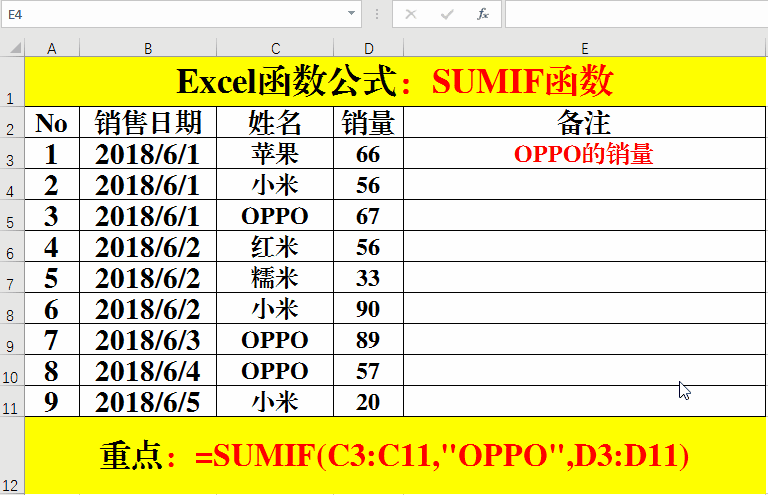 在對應(yīng)的目標(biāo)單元格中輸入公式:=SUMIF(C3:C11,"OPPO",D3:D11)。