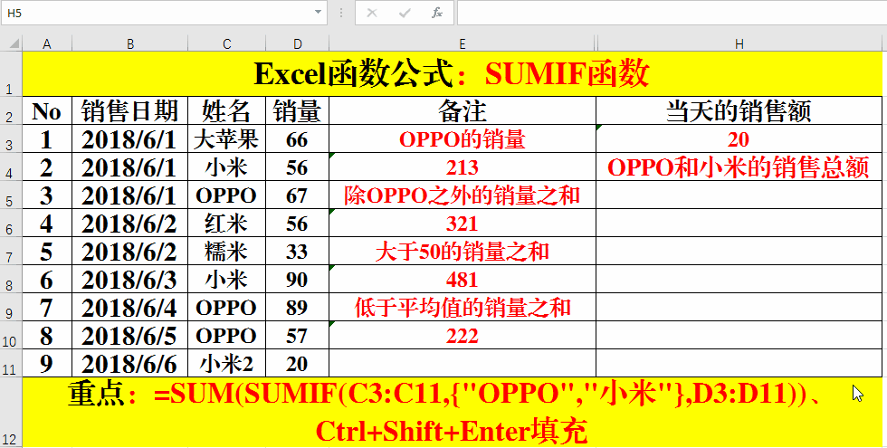 1、在目標(biāo)單元格中輸入公式:=SUM(SUMIF(C3:C11,{"OPPO","小米"},D3:D11))。