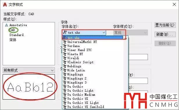 在文字樣式的字體名下拉列表中,同時(shí)列出了操作系統(tǒng)和CAD的小字體,由于操作系統(tǒng)的字體太多,CAD的SHX字體都被淹沒(méi)其中。