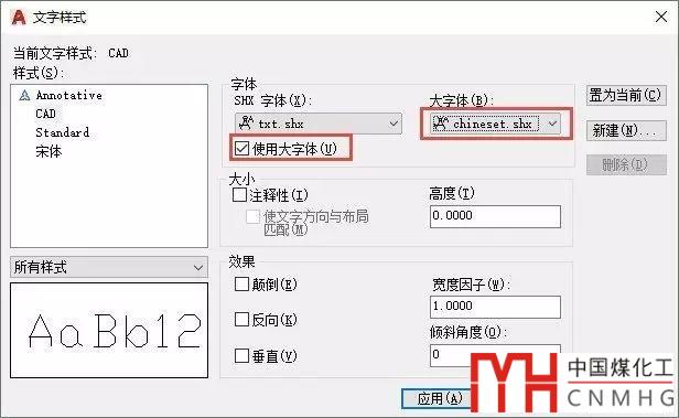 3、勾選“使用大字體”,在右側(cè)的大字體列表中選擇chineseset.shx或hztxt.shx。