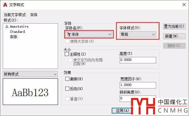 2、在字體下拉列表中選擇宋體,其他參數(shù)可以暫時(shí)不管,這種文字樣式就可以算定義好了。