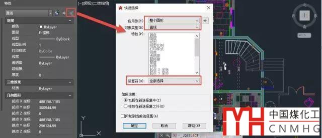 我們可以利用快速選擇來(lái)進(jìn)行分類選擇后進(jìn)行修改。輸入QSELECT命令后回車或直接在特性面板中單擊快速選擇按鈕,打開快速選擇對(duì)話框,選擇應(yīng)用到整個(gè)圖形,在對(duì)象類型中選擇直線,在運(yùn)算符里選擇“選擇全部”,單擊"確定"按鈕,將所有直線選擇出來(lái)。