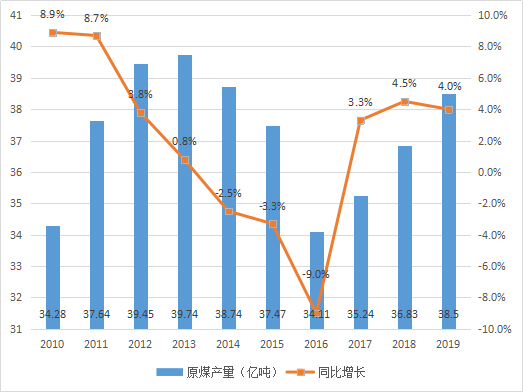 2019年,我國(guó)煤炭結(jié)構(gòu)性去產(chǎn)能不斷深入,原煤生產(chǎn)增速略有回落。2019年,全國(guó)原煤產(chǎn)量完成38.5億噸,同比增長(zhǎng)4.0%。2019年,我國(guó)關(guān)閉退出落后煤礦450處以上,超額完成去產(chǎn)能目標(biāo)任務(wù);對(duì)年產(chǎn)30萬(wàn)噸以下煤礦分類處置,關(guān)閉退出落后煤礦。