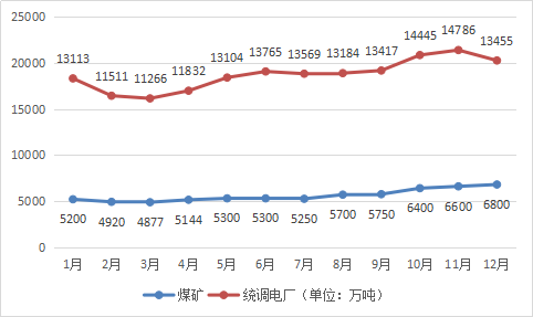 圖2-8 2019年各月末主要煤炭企業(yè)、統(tǒng)調(diào)電廠庫(kù)存變動(dòng)情況