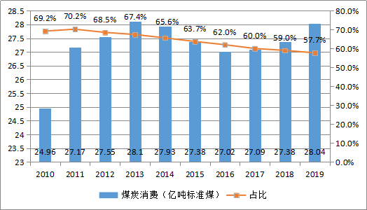 圖2-2 2010~2019年全國(guó)煤炭消費(fèi)總量及占能源消費(fèi)總量的比重