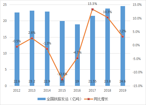 圖2-9 2012~2019年全國(guó)鐵路煤炭發(fā)運(yùn)量及增速