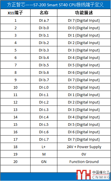 CPU ST40模塊的上部分也有一個端蓋,掀開后可以看到兩個接線端子,左邊編號X10,右邊編號為X11,這是數(shù)字量輸入和電源供電的地方。其中X11的18號端子為24V供電的正極,19號為負(fù)極,20號為功能性接地。具體的針腳定義見下面的表格: