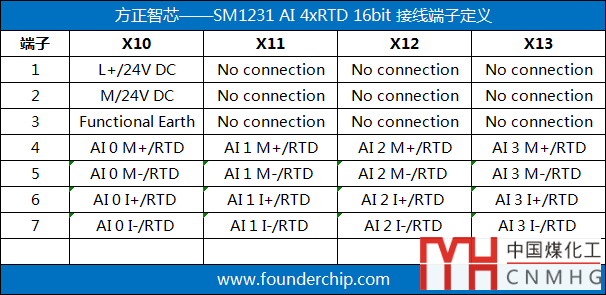 SM1231 AI 4xRTD 16bit有四個接線端子排,上下各兩個。上面兩個端子排的編號為X10和X11,下面兩個端子排的編號為X12和X13。各端子的定義見下面的的表格: