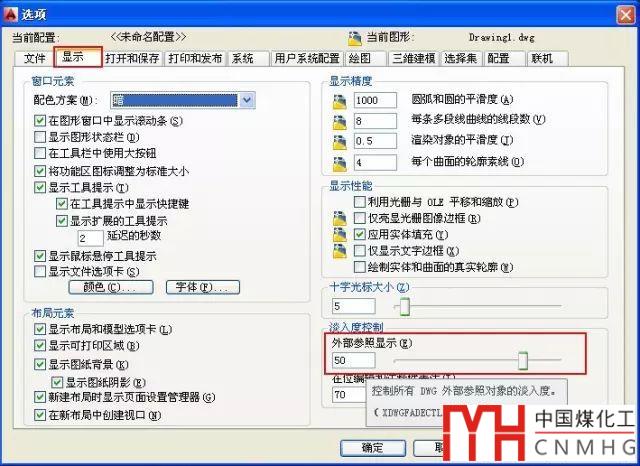 當我們將另一張圖紙插入到當前圖紙中作為外部參照時,為了與當前圖中圖形區(qū)分,外部參照中的圖形也會被暗顯。控制外部參照圖形淡入度的變量是XDWGFADECTL,也比較長,在選項對話框里設置相對比較簡單,輸入OP回車打開選項對話框后,在“顯示”選項卡右下角的淡入度控制中找到“外部參照顯示”選項,如下圖所示。
