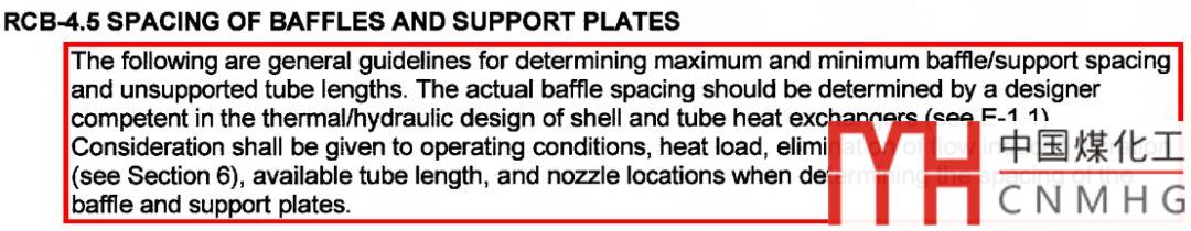 解讀:4.5節(jié)是關于一般折流板,支撐板的最大最小間距,和無支撐跨距的規(guī)定。實際折流板間距應該由傳熱或者水力學計算確定,且考慮操作工況,熱負荷,消除流體誘發(fā)的振動。