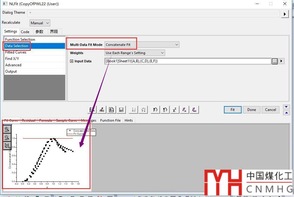 【關(guān)鍵步驟】激活Data Selection頁面,選擇擬合方法為concatenate fit,原本多條曲線使用的是彩色顯示,現(xiàn)在都變成了一種顏色,意思就是多組數(shù)據(jù)一起擬合。