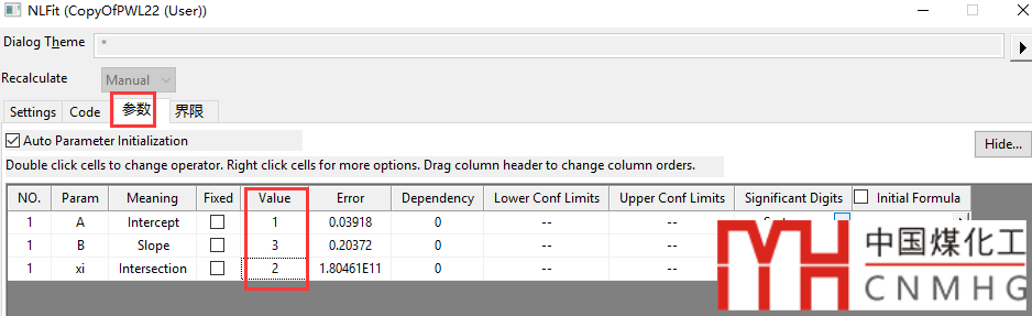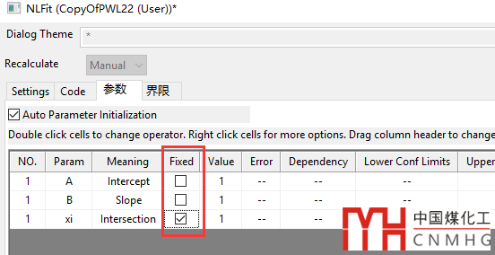 如果分段函數(shù)擬合的分段點結(jié)果不是想要的結(jié)果,可以在Parameters頁面里固定該參數(shù),給定數(shù)值后選擇fixed。