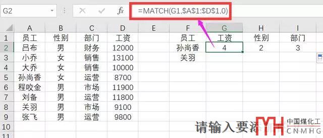 =MATCH(G1,$A$1:$D$1,0)表示,G1單元格的工資,在A1:D1這個區(qū)域第幾個。是第4個,所以結(jié)果是0,MATCH的第3個參數(shù)0表示精確查找。