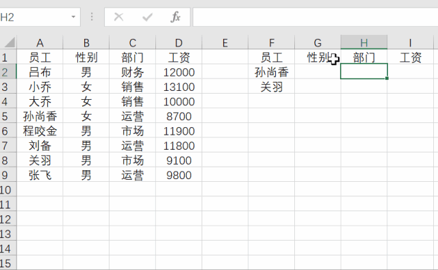 舉個例子,左邊是數(shù)據(jù)源,我們現(xiàn)在需要查找匹配出部分員工的性別,部門,工資等多列信息。