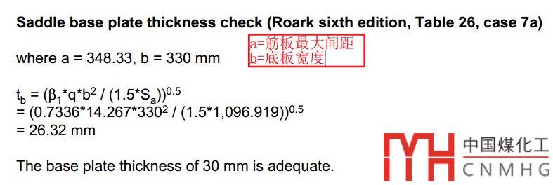 當然不放心的話,可以參考裙座基礎(chǔ)環(huán)板的矩形平板計算公式,將底板的筋板也考慮進去,通常都是可以通過的。