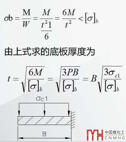 在底板上取單位長度,則單位長度上的力P=σc1*B*1。該力產(chǎn)生的彎矩M=PB/2.其力小于許用應力,即