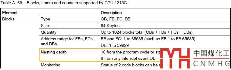 在設(shè)計(jì)復(fù)雜項(xiàng)目的時(shí)候,可以把項(xiàng)目分成的子任務(wù)設(shè)計(jì)成功能塊(FB)或功能(FC)。功能塊(FB)或功能(FC)之間可以相互調(diào)用,當(dāng)被調(diào)用的功能塊內(nèi)部又調(diào)用另一個(gè)功能塊時(shí),這種調(diào)用稱為“嵌套調(diào)用”,調(diào)用的層數(shù)稱為“嵌套深度”。不同的CPU支持的嵌套深度不同,使用時(shí)需要查看下手冊(cè);比如:CPU 1215C的嵌套深度如下圖: