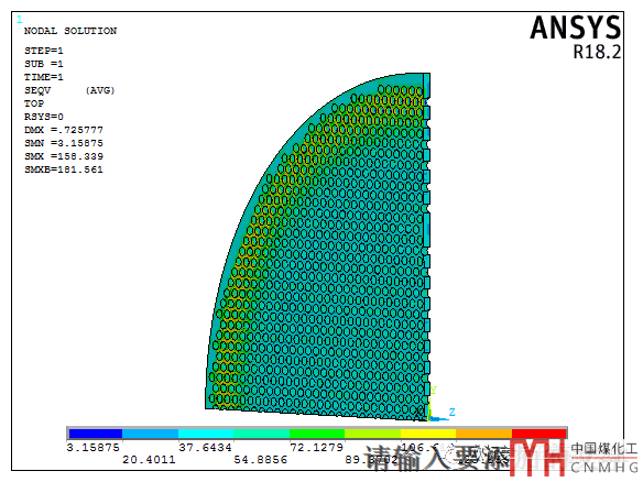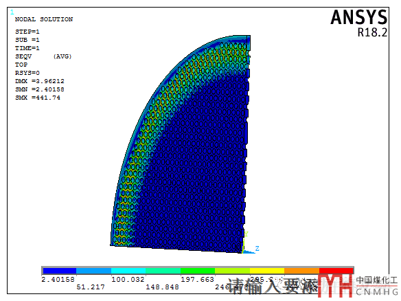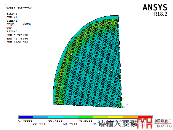 看了這個(gè)結(jié)果意不意外,驚不驚喜!28mm時(shí)最大應(yīng)力441MPa,厚度32mm時(shí)最大應(yīng)力166MPa;厚度差4mm管板的應(yīng)力相差了一倍多。這臺(tái)設(shè)備是轉(zhuǎn)角半徑/厚度大于2.4左右時(shí)應(yīng)力就會(huì)突然增大很多,當(dāng)然了沒(méi)有做多臺(tái)對(duì)比,這個(gè)比值是否固定或有規(guī)律就不太清楚了。發(fā)這個(gè)小文章只給做撓性管板分析的人提醒一下,撓性管板的應(yīng)力不是按厚度線性變化的。對(duì)于接近滿布管的撓性管板,如果強(qiáng)度不過(guò)可能只需要增加2mm就可以了!
