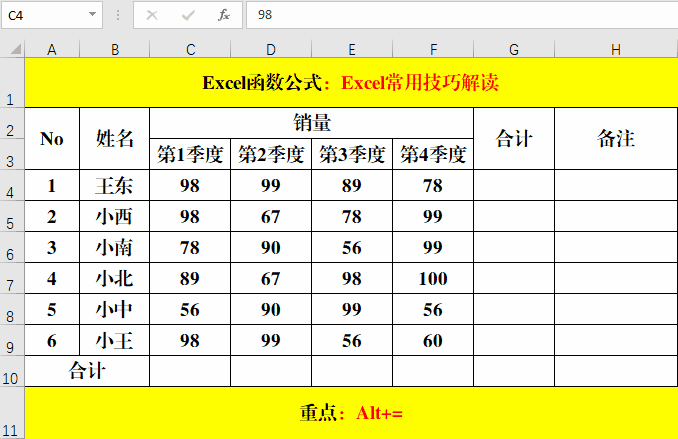 目的:對行、列所有數(shù)據(jù)快速求和。