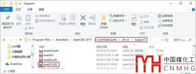 在CAD軟件安裝后會將支持文件放到當前用戶的APPDATA目錄下,因為這些文件可能會在修改界面或設(shè)置后這些支持文件會被修改并保存,因此需要放到一個有讀寫權(quán)限的目錄下,放到APPDATA目錄下可以保證即使用戶不是管理員,軟件也可以正常運行。CAD放到這個目錄下的文件包括界面文件、線型文件、填充文件、工具選項板、打印樣式表文件等,正因為這些文件可能被修改,CAD為了恢復(fù)原始設(shè)置,在CAD的安裝目錄下也將這些支持文件備份了一份,備份文件的文件夾是:UserDataCache,自定義文件就在此文件夾下面的zh-cnSupport文件夾中,zh-cn表示中文簡體,如下圖所示。