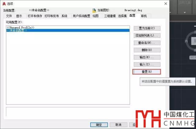 輸入OP,回車,在選項對話框中單擊配置選項卡,在配置選項卡中選擇一個配置,默認為:未命名配置,單擊重置按鈕,如圖所示。