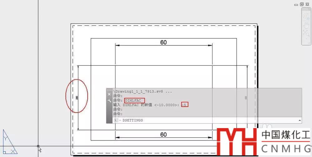 輸入DIMLFAC,回車,輸入要設(shè)置的比例值,如-5,回車,然后標(biāo)注,如圖所示。