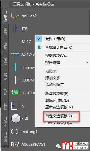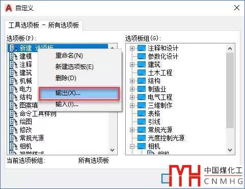 在CAD的工具選項板中右鍵,打開自定義選項板對話框,可以輸出和輸入選項板,如下圖所示。