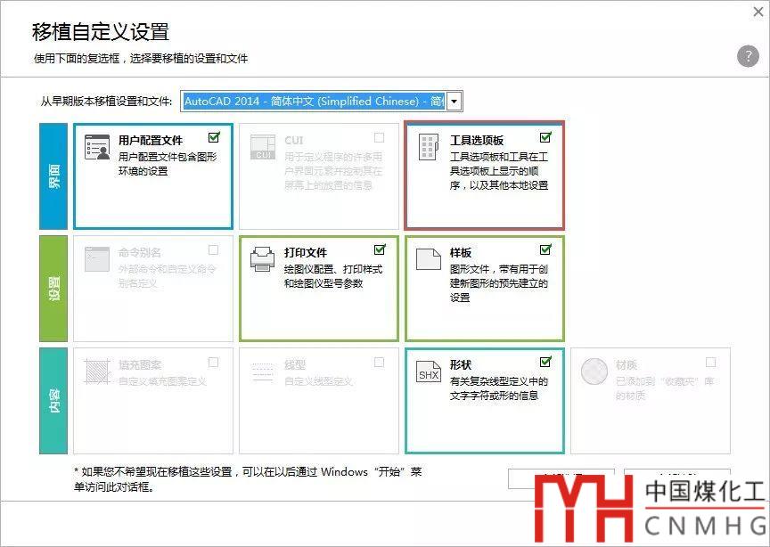 我們可以移植全部設(shè)置,也可以只選擇移植工具選項板,但如果版本差別太大,工具選項板也可能出現(xiàn)兼容的問題。