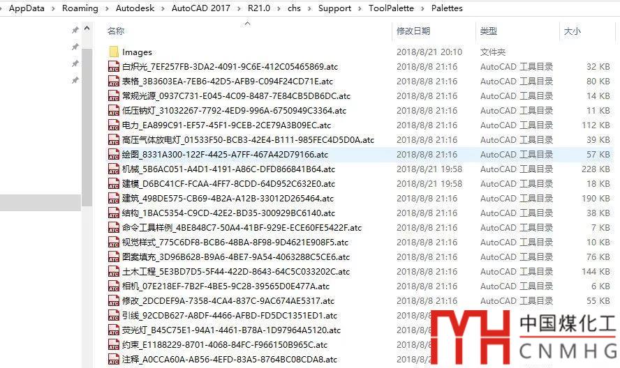 大家可以找到工具選項板所在的目錄,如AUTOCAD 2017版的工具選項吧路徑為:C:Users用戶名AppDataRoamingAutodeskAutoCAD 2017R21.0chsSupportToolPalette,在這個目錄下首先有一個工具選項板的總目錄文件:AcTpCatalog.atc,下面有一個Palettes文件夾,文件夾里則是單個工具選項板的索引,如下圖所示。
