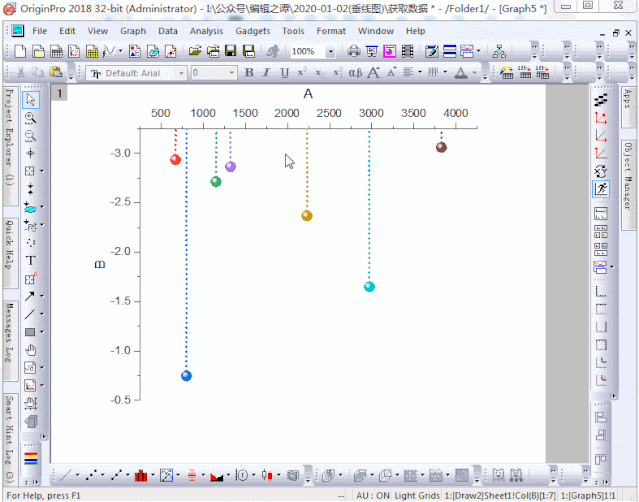 通過前面的數(shù)據(jù)拾取,我們得到一個“畫”出來的數(shù)據(jù)表。選中Draw表中數(shù)據(jù),點擊Scatter工具繪制散點圖,雙擊散點,在屬性窗口中“Dropline”頁面,勾選垂線,選擇線型為“short dot”短點。