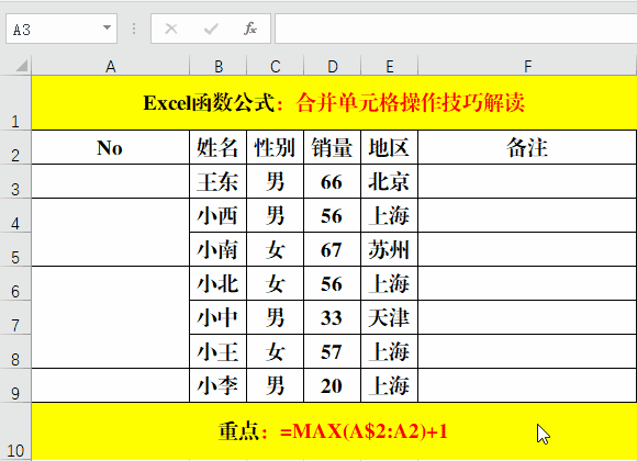2、Max函數(shù)的作用是計算指定區(qū)域中的最大值,是針對數(shù)值而言的。此用法中的參數(shù)A2為當前填充單元格的上一單元格,1為修正值,指從1開始填充,如果從N開始填充,則將“1”替換為N即可。
