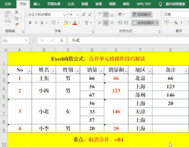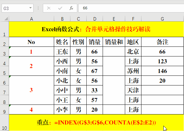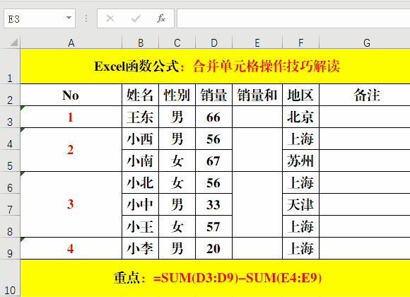 1、此處的合并單元格指“不規(guī)則”的合并單元格,當然對于“規(guī)則”的合并單元格同樣是適用的。