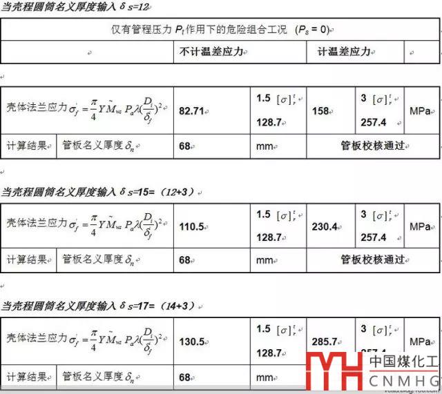 按常規(guī)通行的計算程式SW-6中輸入殼程圓筒δs=12,計算結(jié)果通過。此次反映在計算頁中的殼體法蘭應(yīng)力值σf 不大,為許用值61%。