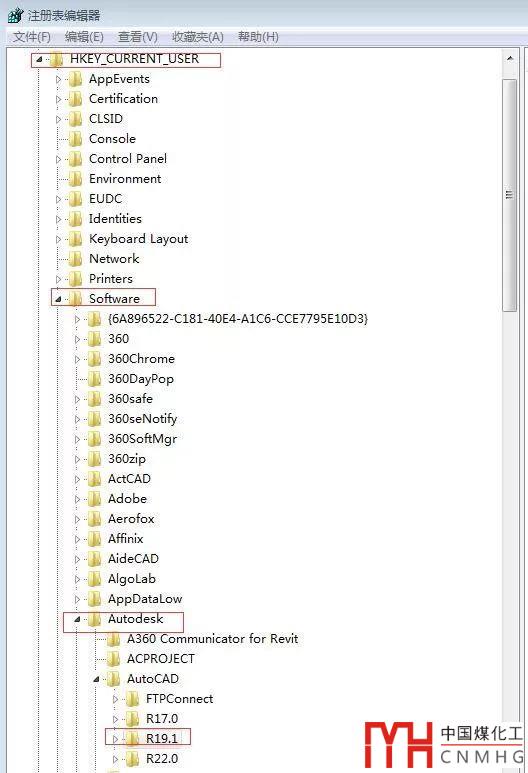 3、刪除注冊表中CURRENTUSER下AUTOCAD版本對應的注冊表。