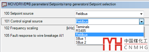 MDX61B支持四種控制信號源:端子(Terminals)、RS485、Fieldbus、SBus1和SBus2,如下圖: