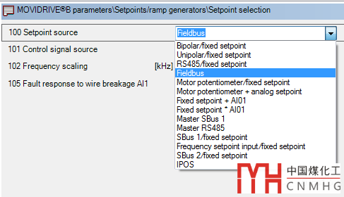 無論是“速度給定”還是“頻率給定”,都可以簡稱為“給定”。給定值的信號來源,稱為“給定源(setpoint source)”。SEW的MDX61B變頻器的P100參數(shù)用來配置變頻器的給定源(setpoint source),如下圖: