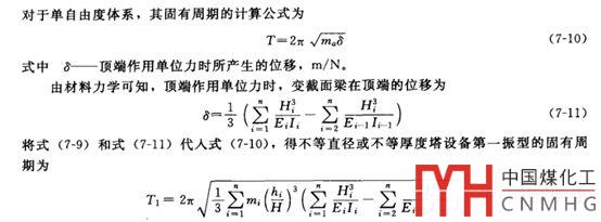 對(duì)于多自由度體系,一般不通過其振動(dòng)方程求周期,因?yàn)闊o法進(jìn)行手算且計(jì)算量大。而是采用計(jì)算量小、精度高的近似方法,如等效質(zhì)量法。等效質(zhì)量法的思想是,用一個(gè)等效單質(zhì)點(diǎn)體系來代替原來的多質(zhì)點(diǎn)體系,等效原則及其計(jì)算方法見文獻(xiàn)[2]的3.5.3。NB/T47041中“直徑、厚度或材料沿高度變化的塔器”即采用此方法,見NB/T47041標(biāo)準(zhǔn)釋義P31。