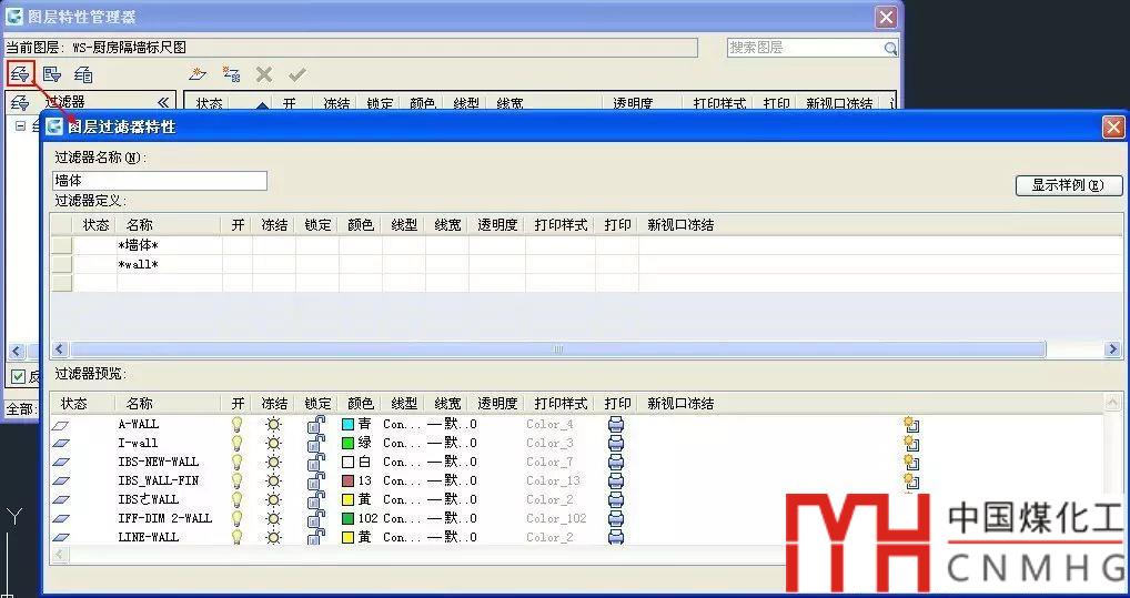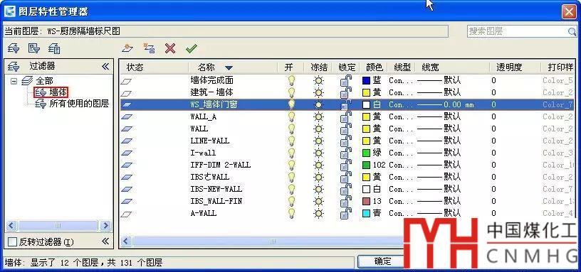 在上面的過濾器中,我們設(shè)置了兩個過濾條件,都是用名稱來過濾的,分別是*墻體*和*WALL*,就是將圖層名字中帶墻體和WALL的圖層都過濾出來,過濾結(jié)果如下圖所示。