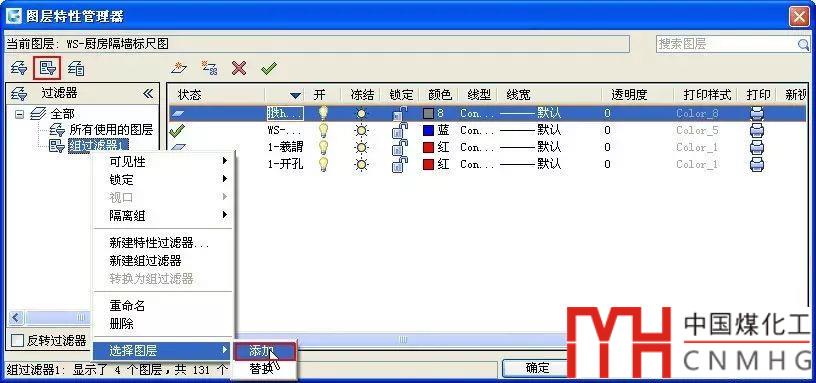 1)右鍵單擊組過濾器,在菜單中選擇“選擇圖層>添加”,然后可以在圖形窗口中拾取圖形,將這些圖形所在的圖層添加到組過濾器中。如下圖所示。