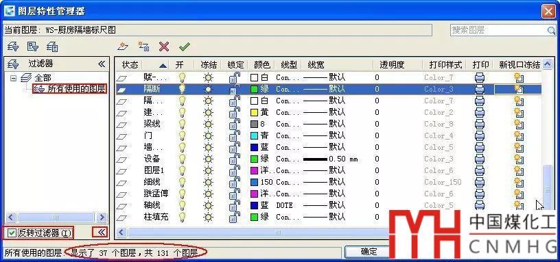 在圖層特性管理器中已默認(rèn)添加了一個過濾器:所有使用的圖層,可以顯示所有圖層上有圖形對象的圖層,也可以勾選“反轉(zhuǎn)過濾器”,顯示所有沒有對象的圖層。如下圖所示。