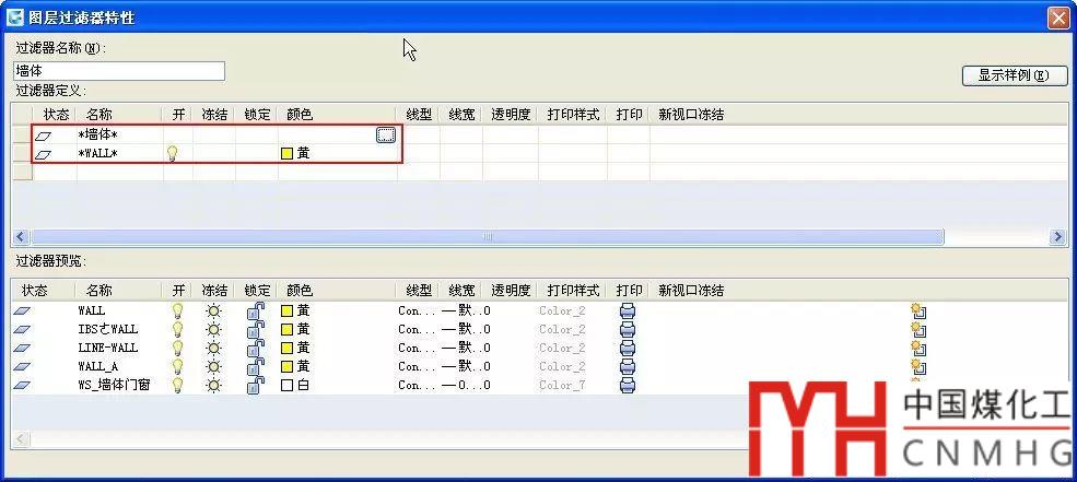 如果要設(shè)置多個過濾器的話,最好給每個過濾器取一個比較容易分辨的名稱,例如我們在一張建筑圖紙中可以將與墻體相關(guān)的圖層過濾出來,過濾器名稱被命名為“墻體”,如下圖所示。