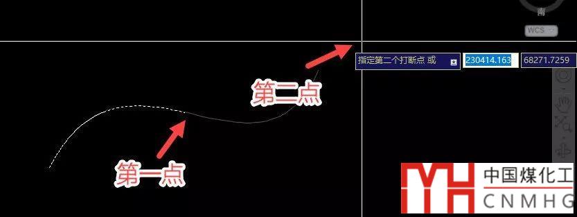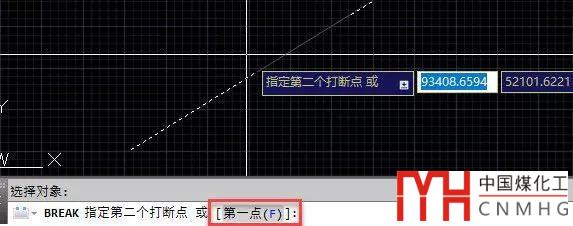 執(zhí)行打斷命令并選擇對象后,注意看命令行提示,此時除提示我們指定第二點(diǎn)外,還提供了輸入F重新指定第一點(diǎn)的選項(xiàng),如下圖所示。