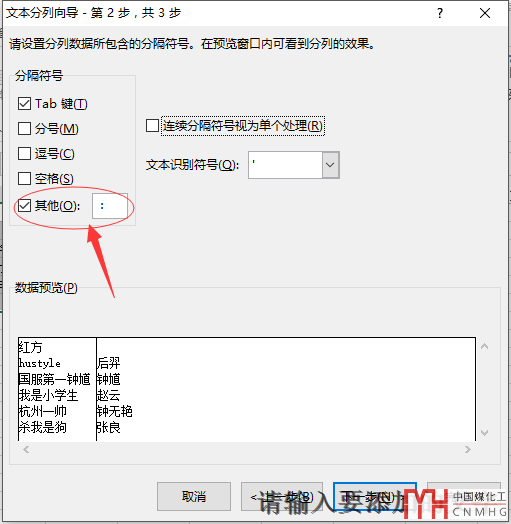 選擇分隔符號(hào)其他,并且輸入符號(hào)“:”點(diǎn)擊下一步,對(duì)每列區(qū)域格式進(jìn)行調(diào)整