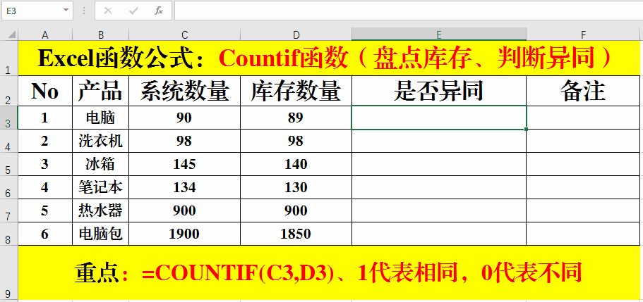這里用到的函數(shù)公式是:=COUNTIF(C3,D3),Countif函數(shù)的第一個(gè)參數(shù)就是條件范圍,第二個(gè)參數(shù)就是條件值,也就是判斷兩個(gè)數(shù)量是否一致,就是求滿足參數(shù)2的條件,如果是相同則返回1,否則返回0。